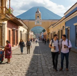 Ontdek de koloniale charme van Antigua Guatemala met een wandelroute langs cobblestone straten, historische kerken en het Santa Catalina Arch.